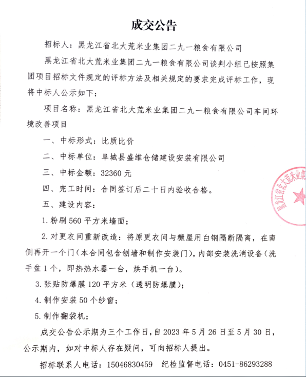 黑龍江省北大荒米業集團二九一糧食有限公司車間環境改善項目成交公告