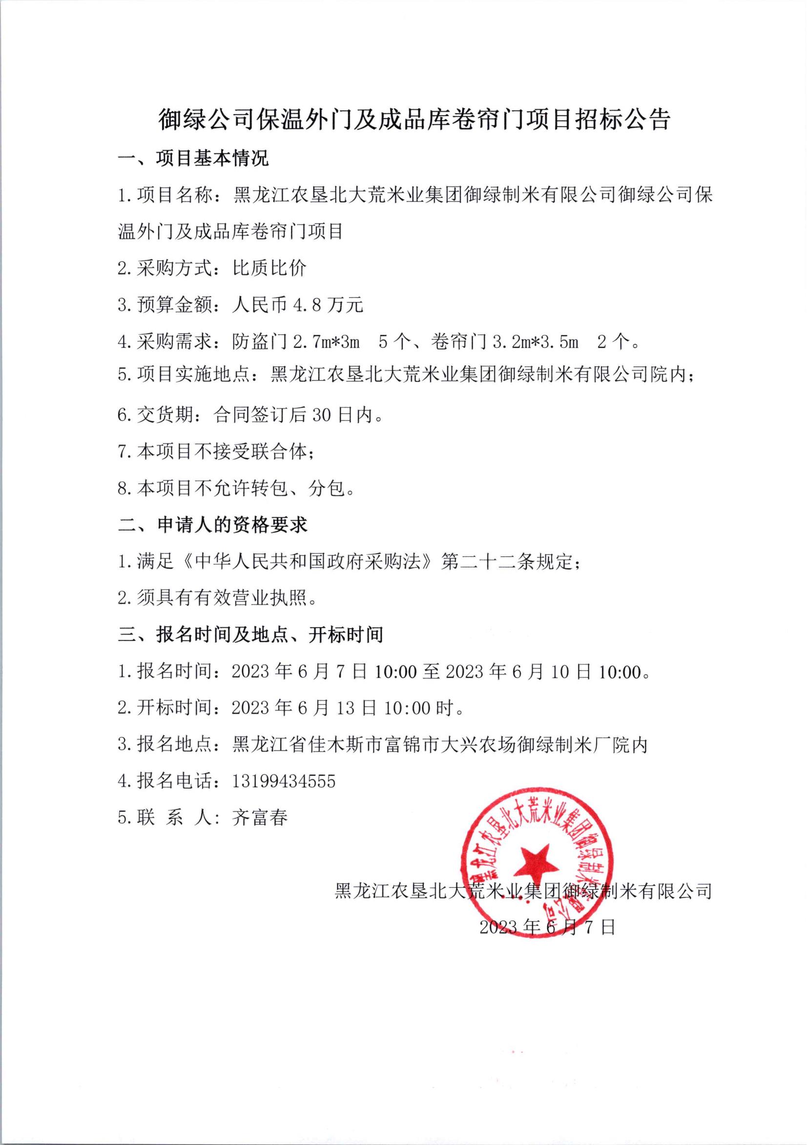 御綠公司保溫外門及成品庫卷簾門項目招標公告
