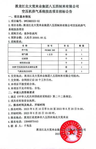北大荒米業八五四公司空壓機供氣系統技改項目招標公告