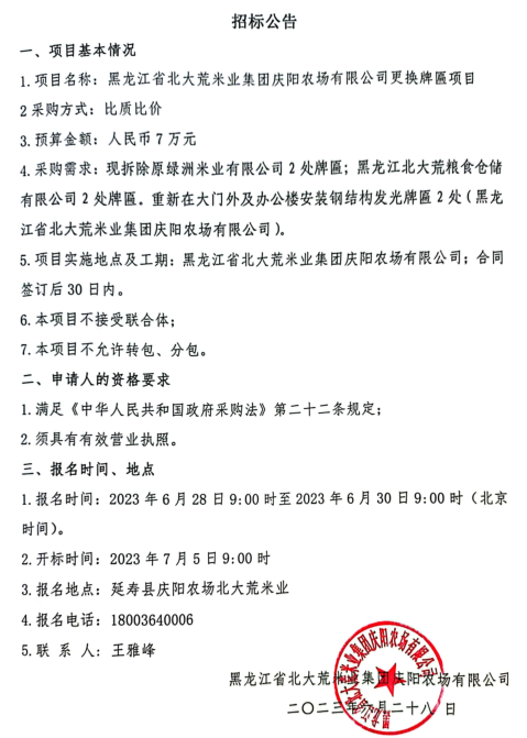 黑龍江省北大荒米業集團慶陽農場有限公司更換牌匾項目招標公告