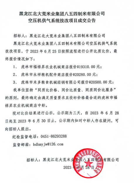 黑龍江省北大荒米業集團八五四制米有限公司空壓機供氣系統技改項目成交公告