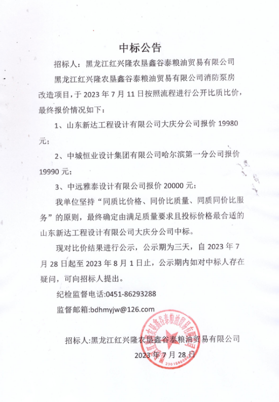 黑龍江省紅興隆農墾鑫谷泰糧油貿易有限公司消防泵房改造項目中標公告