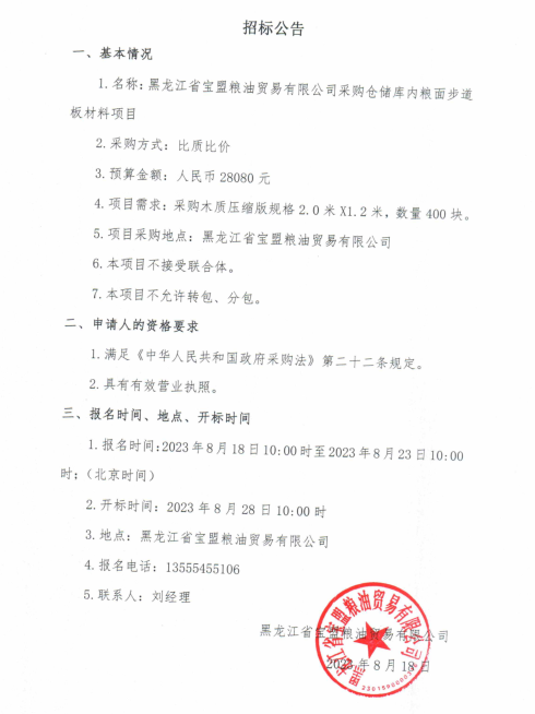 黑龍江省寶盟糧油貿易有限公司采購倉儲庫內糧面步道板材項目招標公告