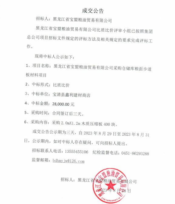 黑龍江省寶盟糧油貿(mào)易有限公司采購倉儲庫內(nèi)糧面步道板材項目中標(biāo)公告