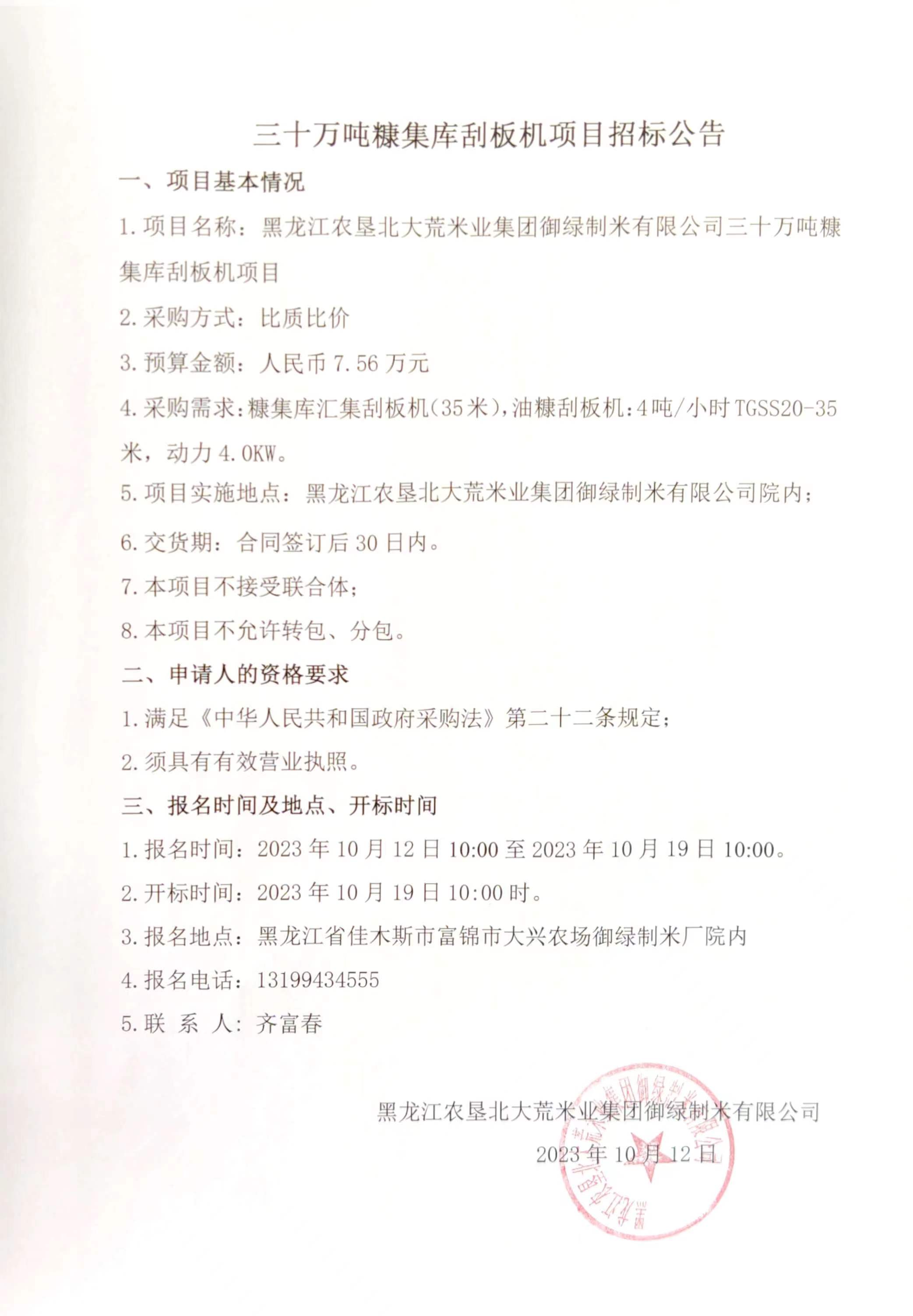黑龍江農(nóng)墾北大荒集團(tuán)御綠制米有限公司三十萬噸糠集庫刮板機(jī)項(xiàng)目招標(biāo)公告