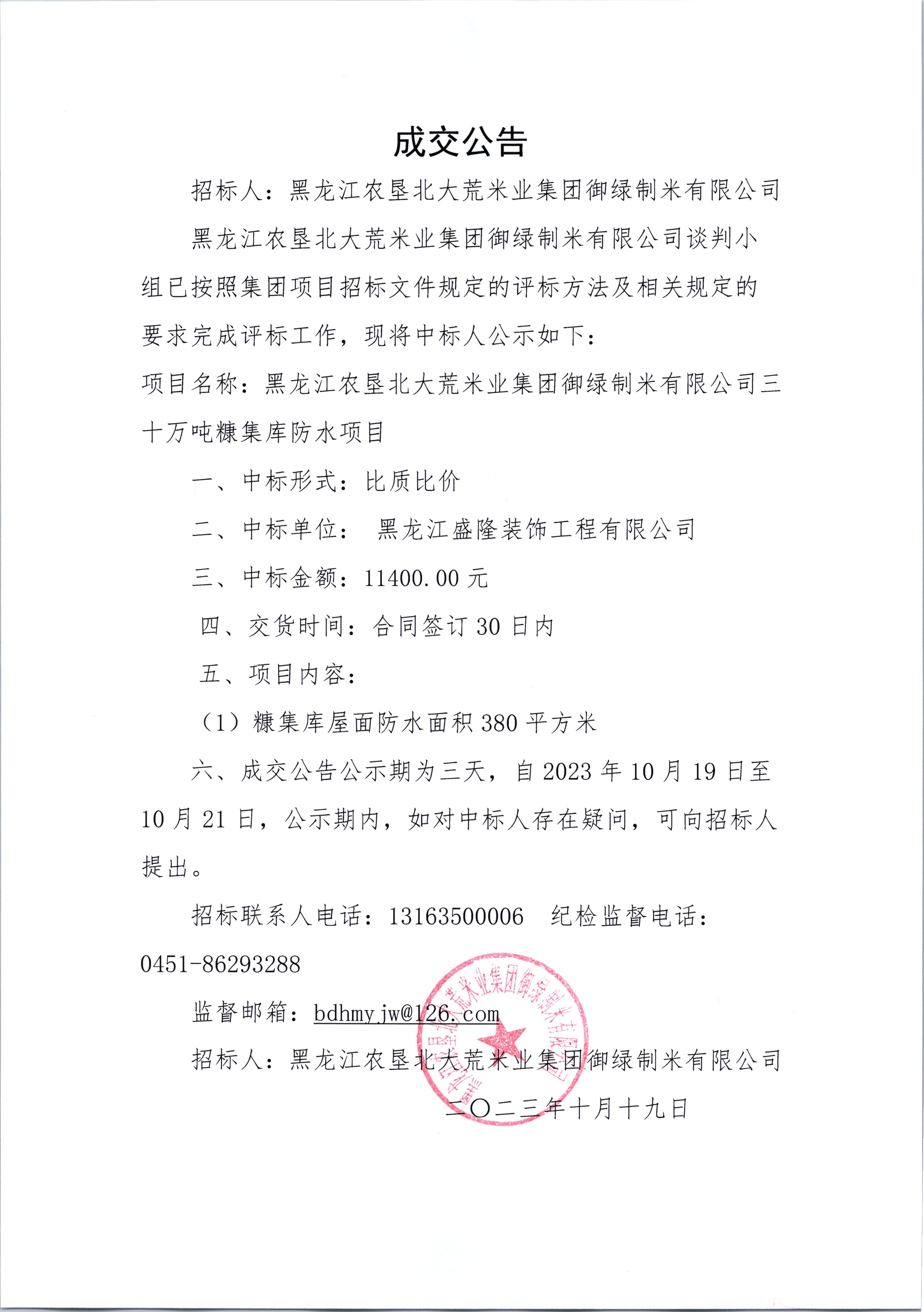龍江農(nóng)墾北大荒米業(yè)集團御綠制米有限公司三十萬噸糠集庫防水項目成交公告