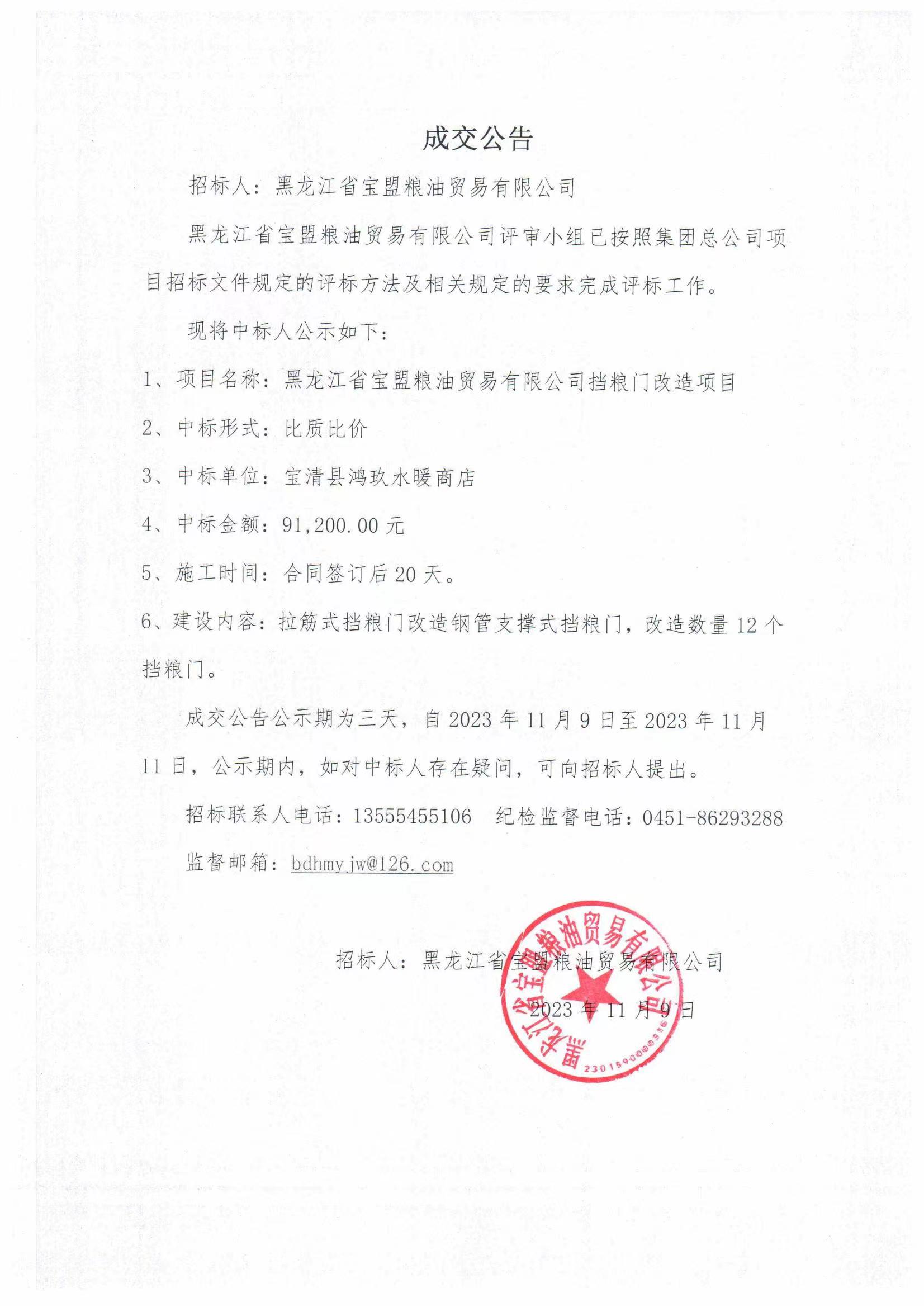 黑龍江省寶盟糧油貿(mào)易有限公司擋糧門改造項目成交公告
