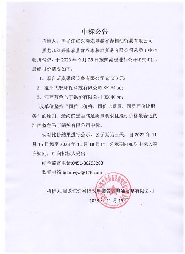黑龍江紅興隆農(nóng)墾鑫谷泰糧油貿(mào)易有限公司中標(biāo)公示