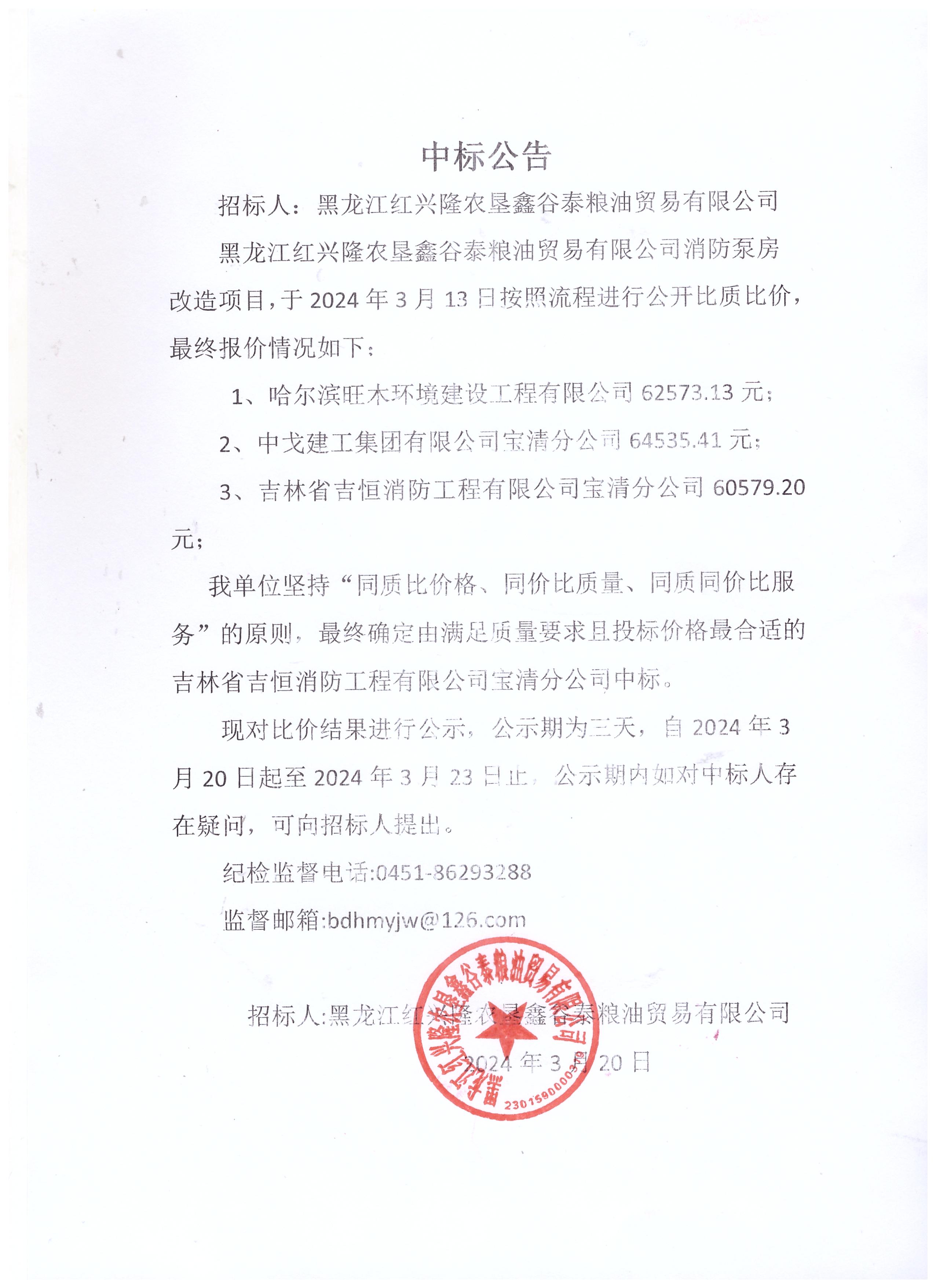 黑龍江紅興隆農墾鑫谷泰糧油貿易有限公司消防泵房改造項目中標公告