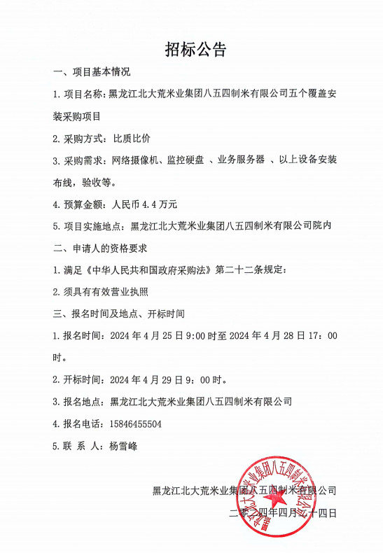 北大荒米業854制米公司五個覆蓋安裝采購項目招標公告