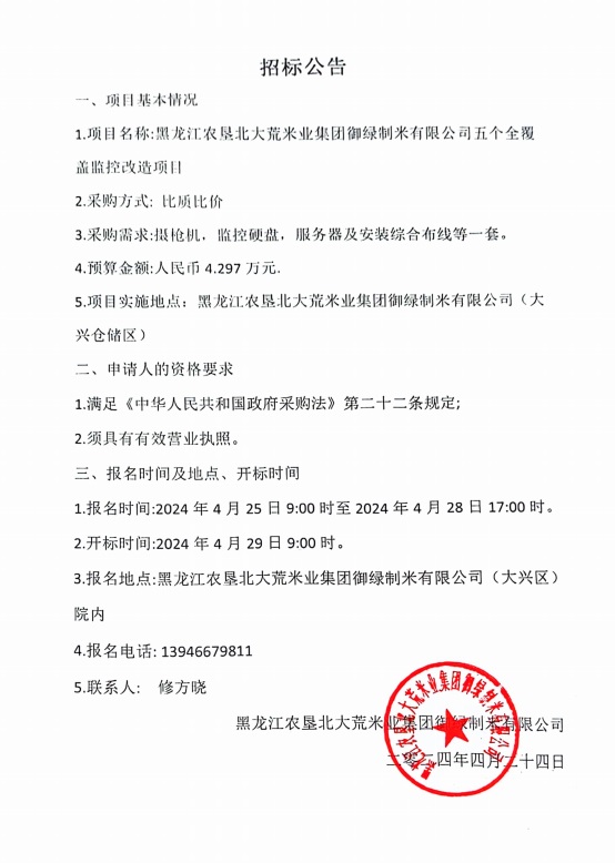 北大荒米業御綠公司五個全覆蓋監控改造項目招標公告