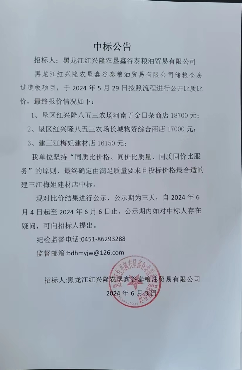 黑龍江紅興隆農墾鑫谷泰糧油貿易有限公司糧儲倉房過道板項目中標公告