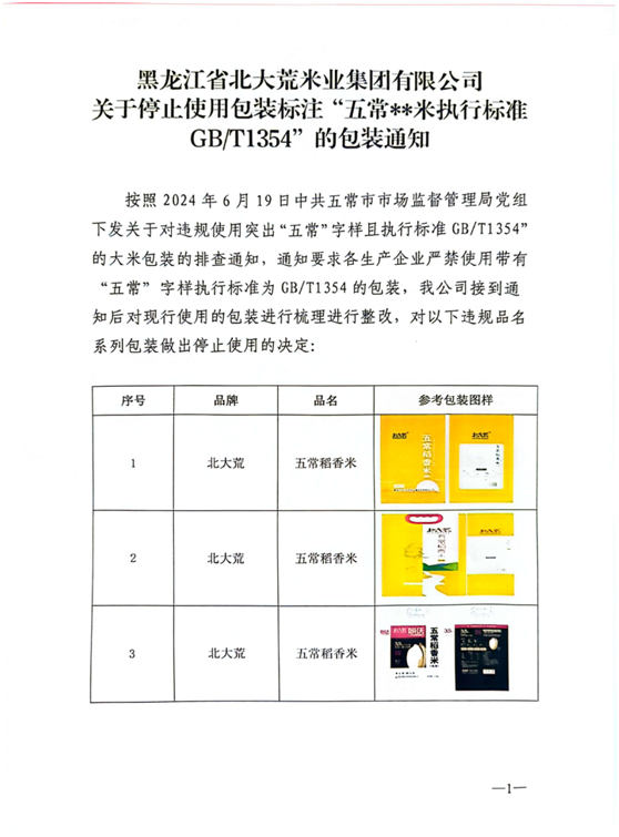 關(guān)于停止使用包裝標(biāo)注“五常**米執(zhí)行標(biāo)準(zhǔn)GB/T1354”的包裝通知