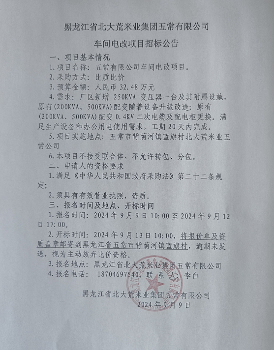 黑龍江省北大荒米業(yè)集團五常有限公司 車間電改項目招標公告