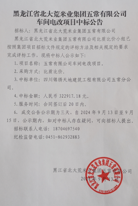 黑龍江省北大荒米業集團五常有限公司車間電改項目中標公告