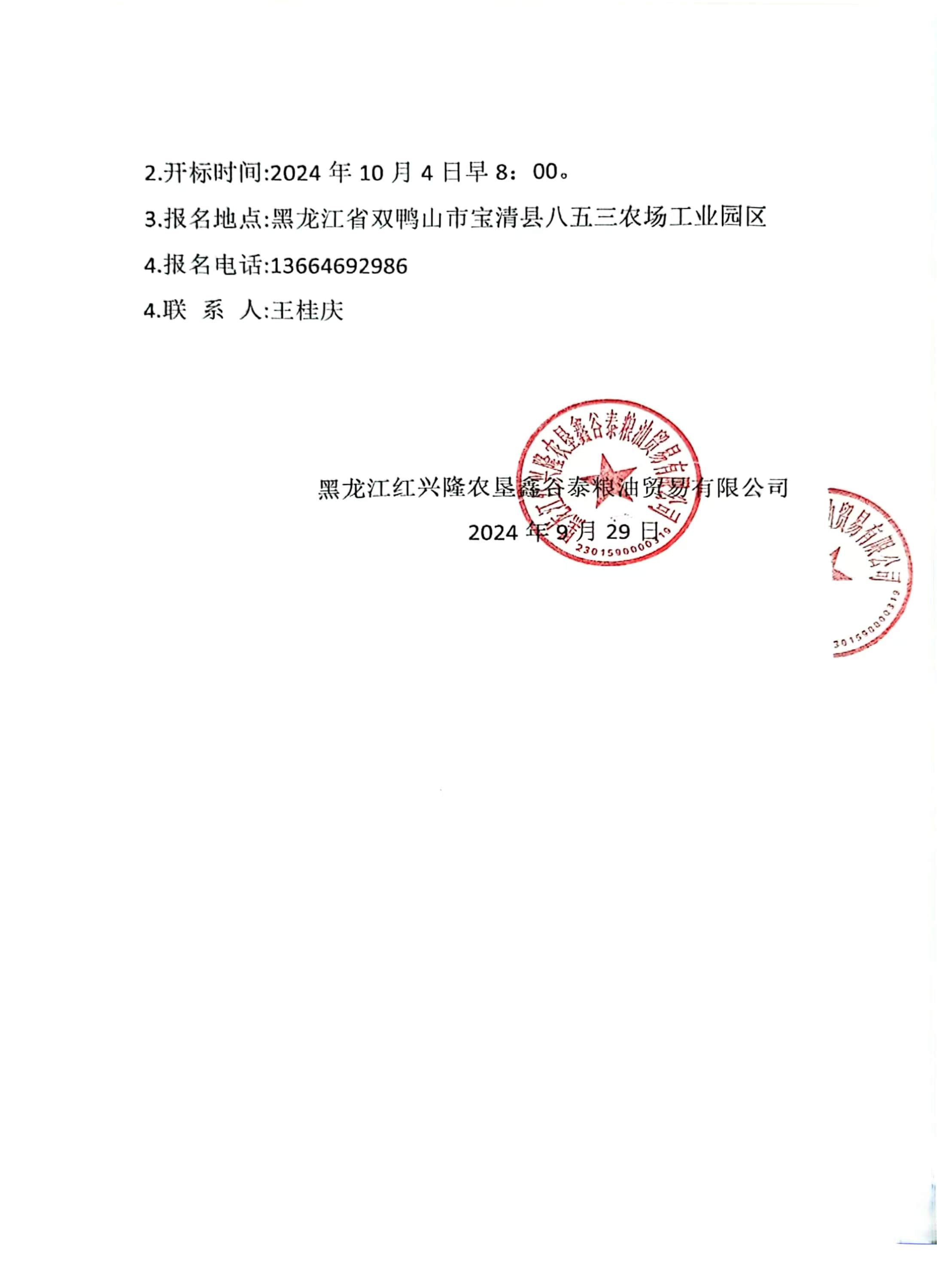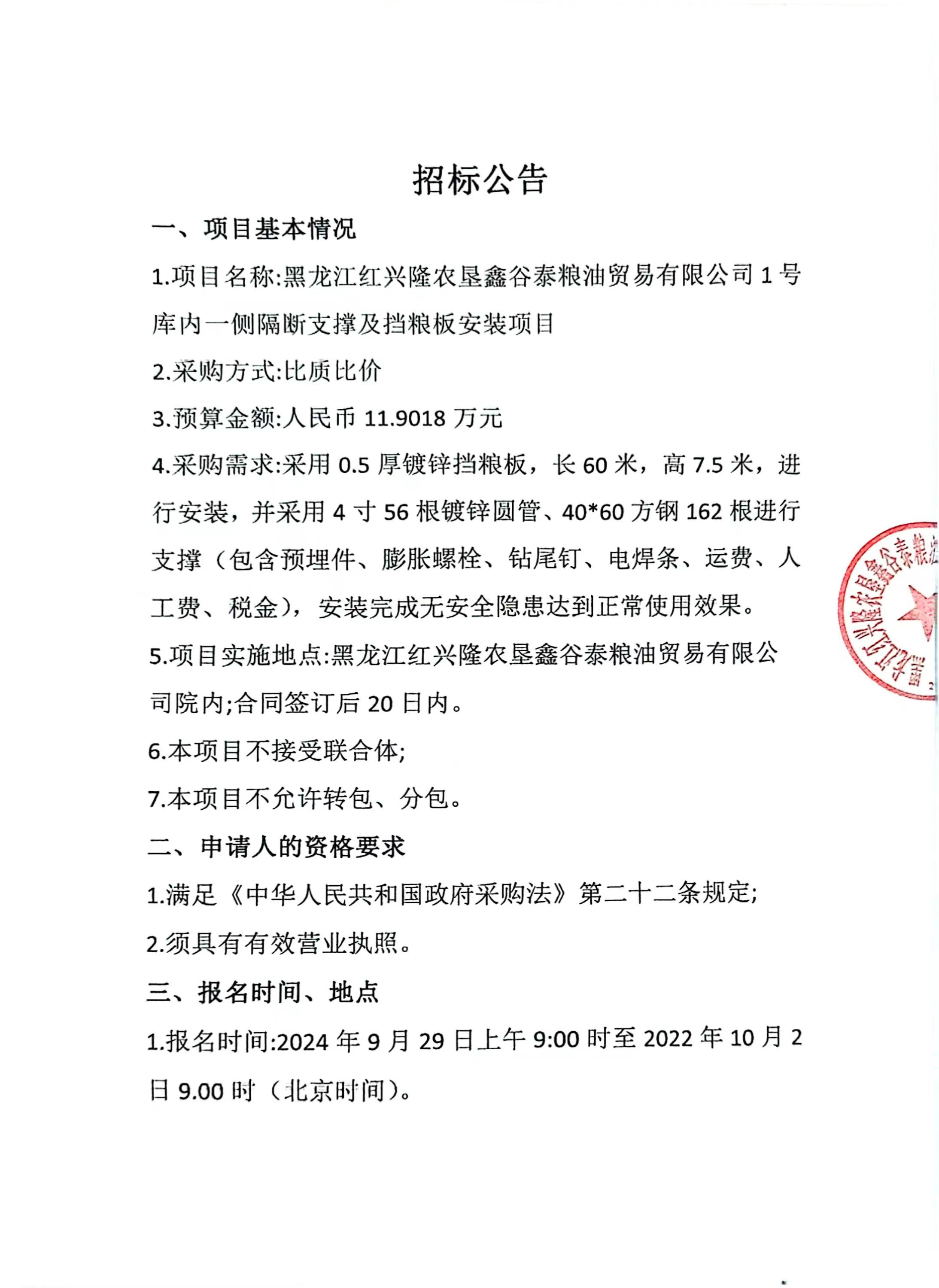 黑龍江紅興隆農墾鑫谷泰糧油貿易有限公司1號庫內一側隔斷支撐及擋糧板支撐及擋糧板安裝項目招標公告
