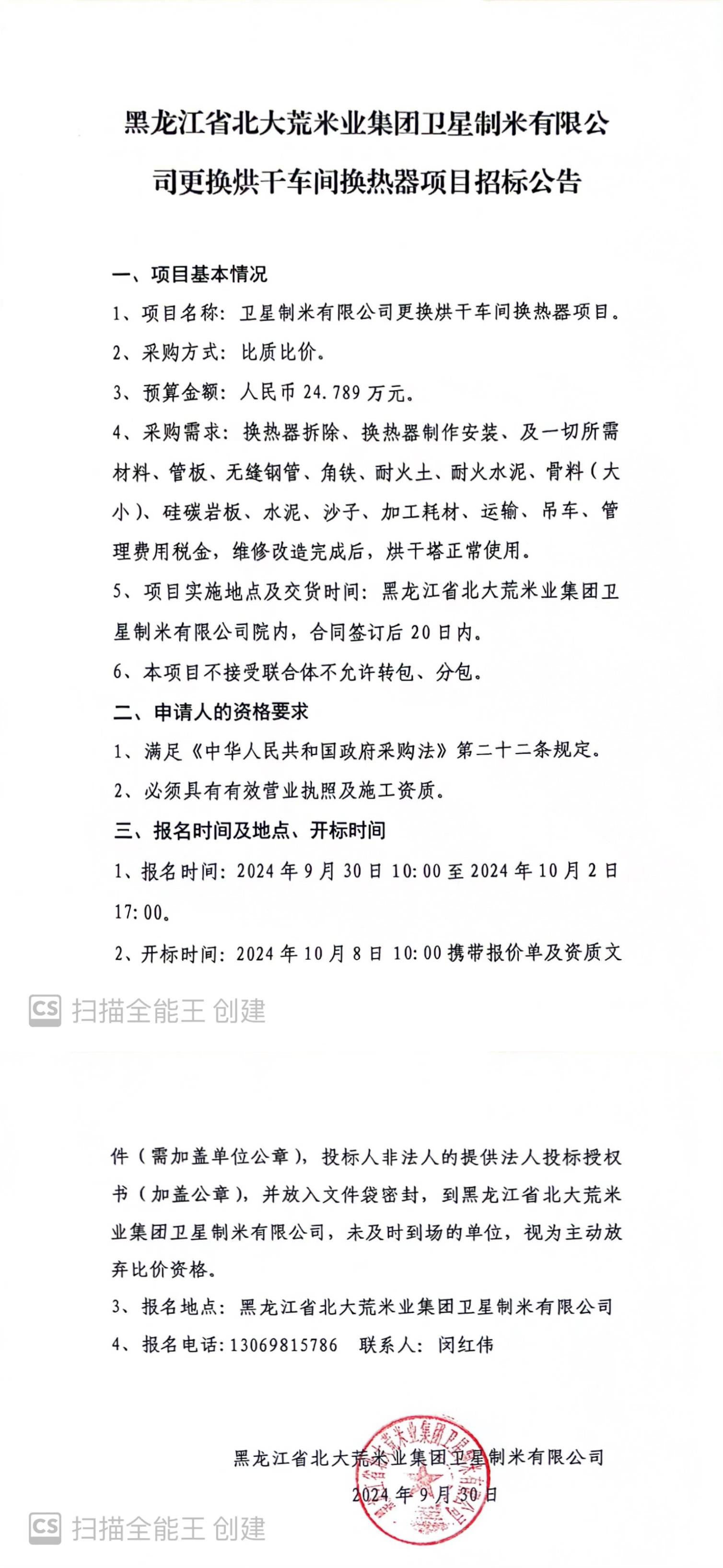 衛星制米有限公司更換烘干車間換熱器項目招標公告
