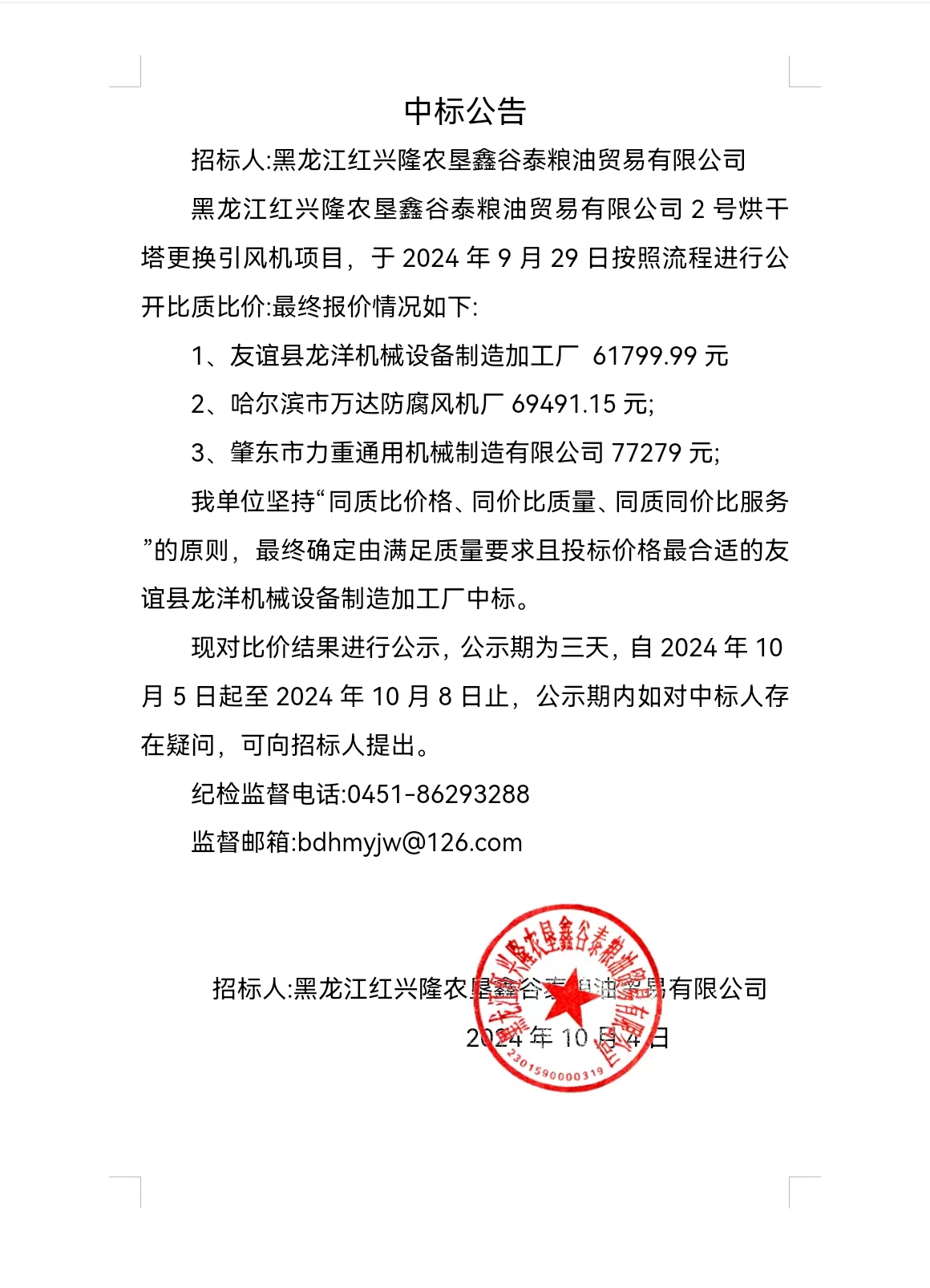 鑫谷泰糧油公司2號烘干塔更換引風機項目中標公告