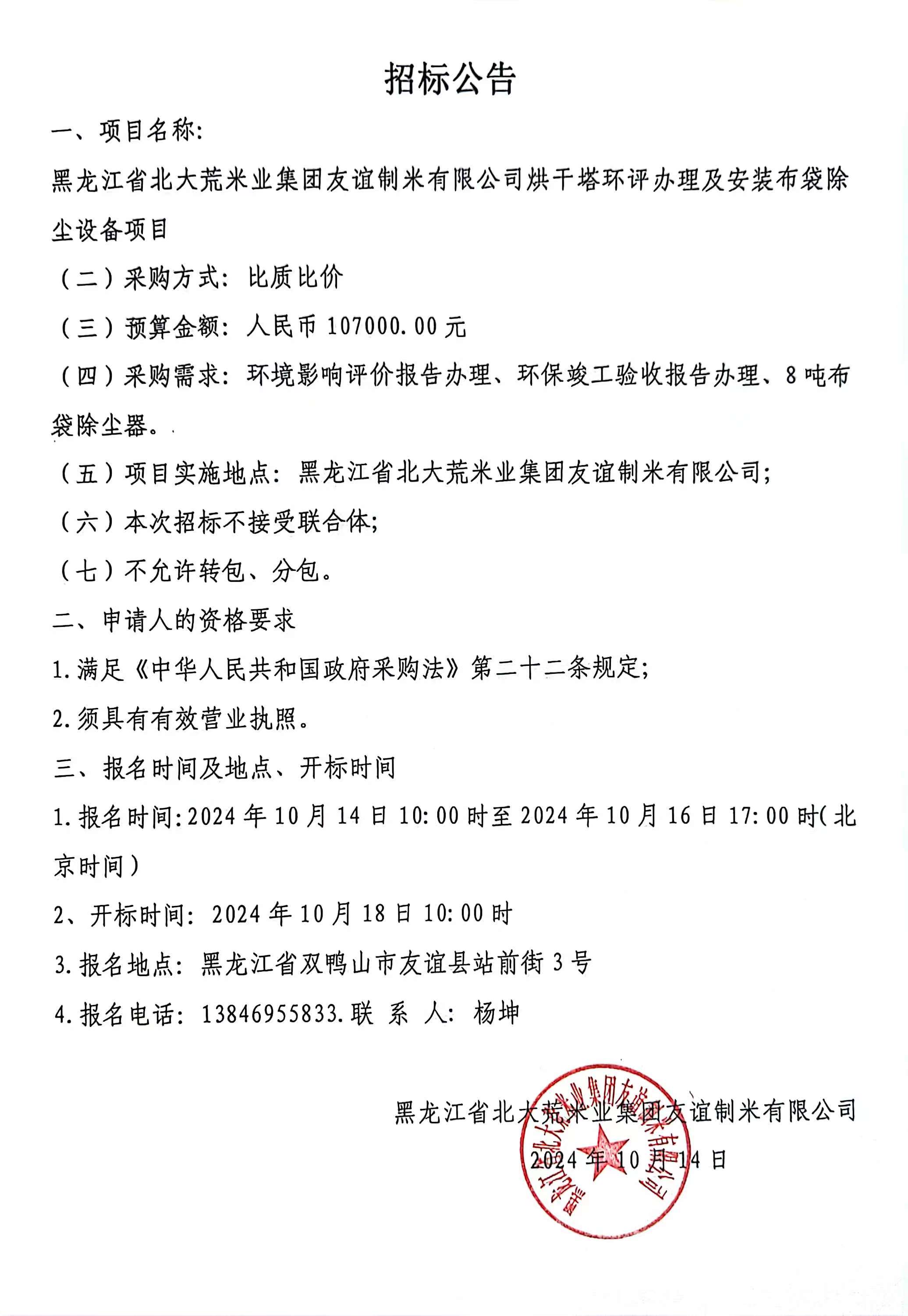 黑龍江省北大荒米業(yè)集團友誼制米有限公司烘干塔環(huán)評辦理及安裝布袋除塵設(shè)備項目招標(biāo)公告