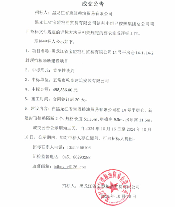 寶盟糧油貿易有限公司擋糧隔斷建設項目中標公告