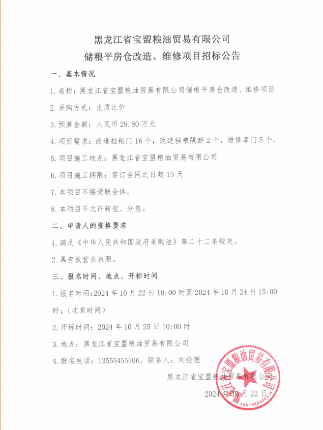 寶盟糧油貿易有限公司儲糧平房倉改造、維修項目招標公告