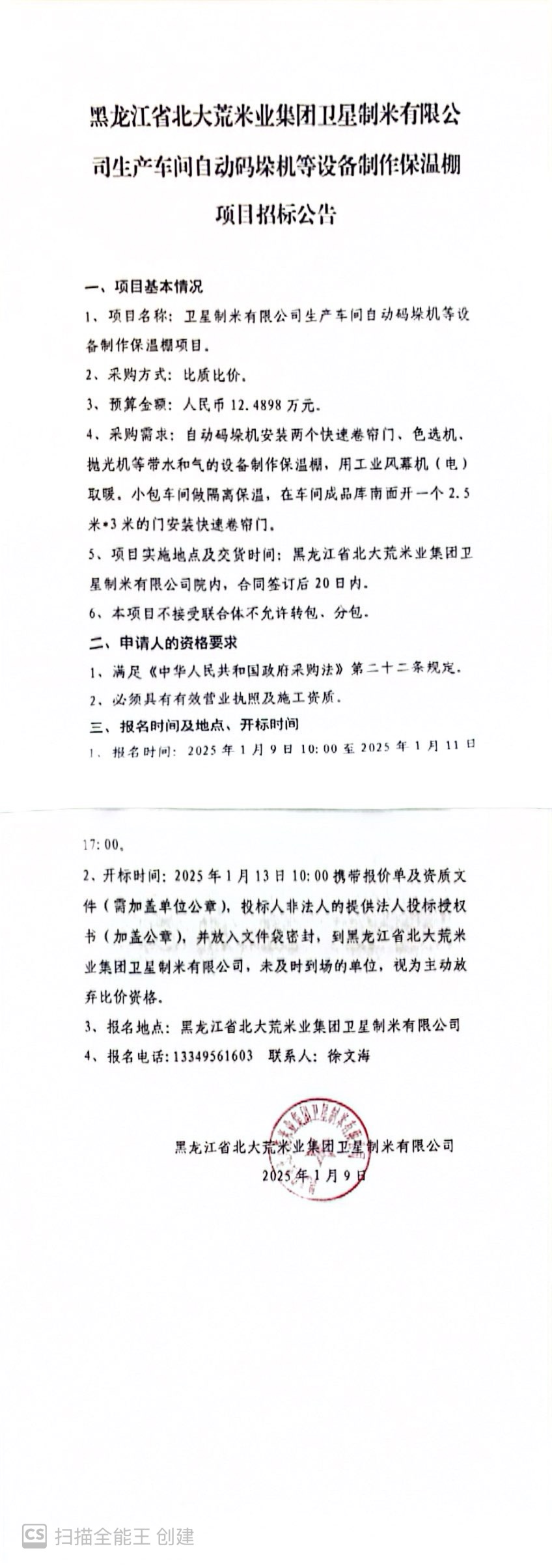 黑龍江省北大荒米業集團衛星制米有限公司生產車間自動碼垛機等設備制作保溫棚項目招標公告