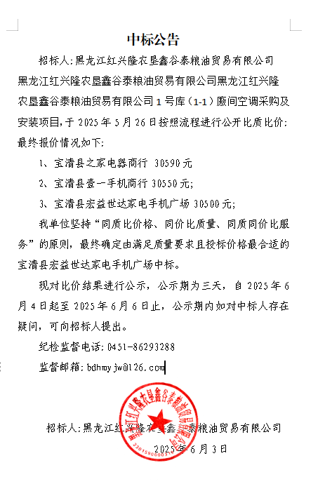 黑龍江紅興隆農(nóng)墾鑫谷泰糧油貿(mào)易有限公司1號庫空調(diào)采購及安裝項目中標(biāo)公告