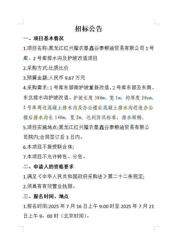 黑龍江紅興隆農墾鑫谷泰公司國儲糧1號、2號排水溝及護坡改造項目招標公告