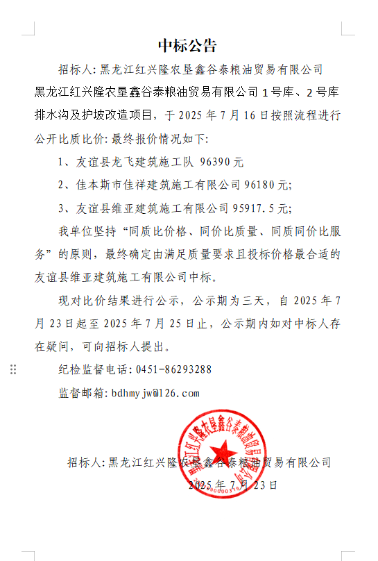 黑龍江紅興隆農(nóng)墾鑫谷泰糧油貿(mào)易有限公司1號庫、2號庫排水溝及護坡改造項目中標(biāo)公告