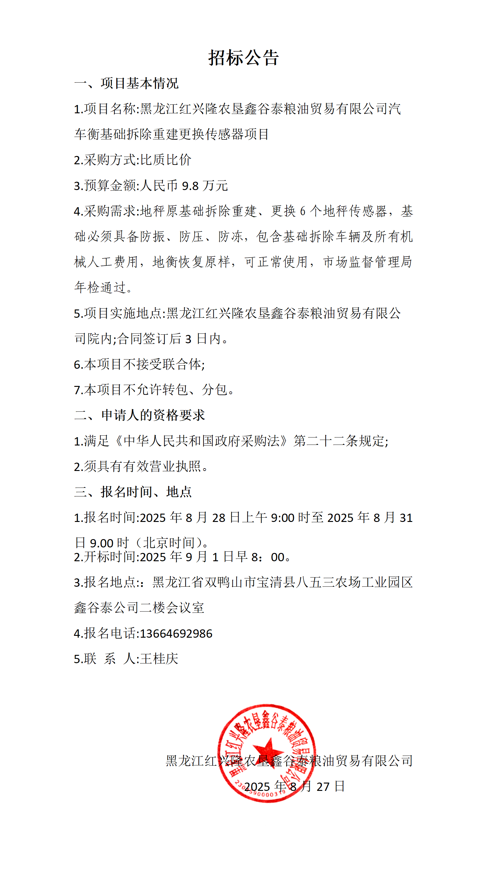 黑龍江紅興隆農(nóng)墾鑫谷泰糧油貿(mào)易有限公司汽車衡基礎(chǔ)拆除重建更換傳感器項(xiàng)目招標(biāo)公告
