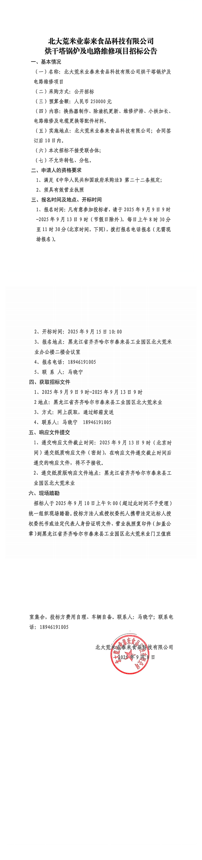 北大荒米業泰來食品科技有限公司烘干塔鍋爐及電路維修項目
