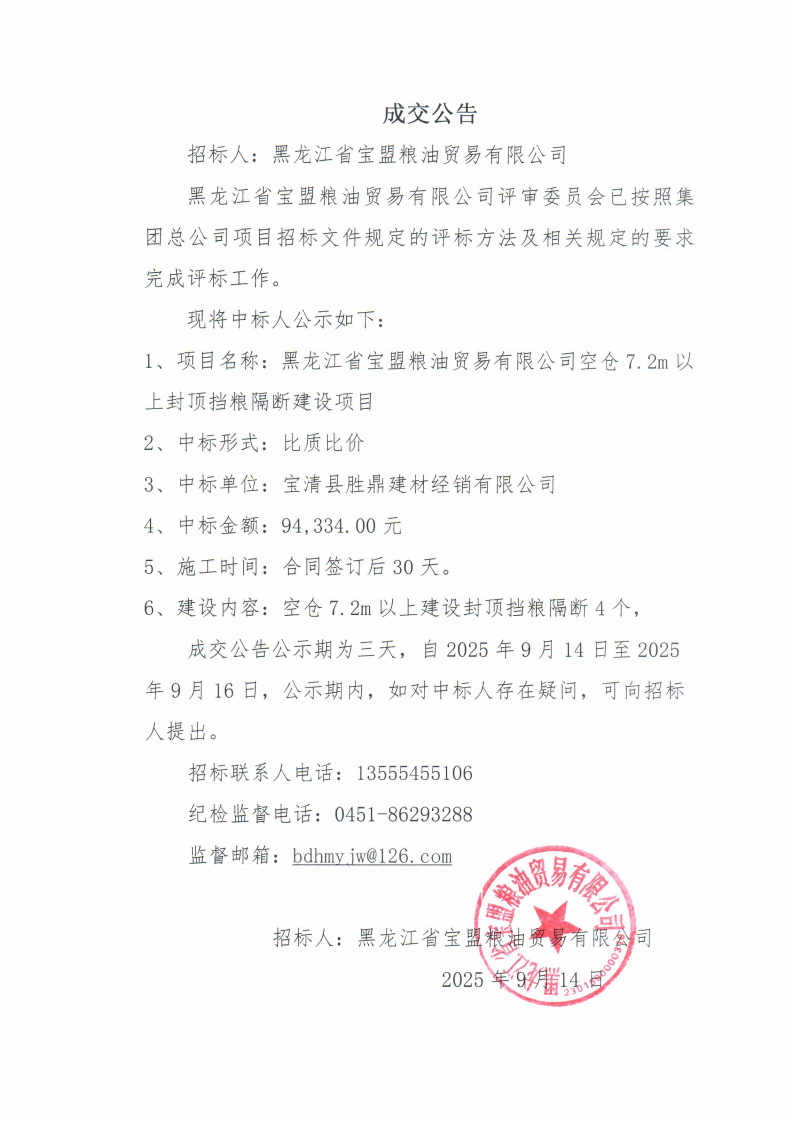 寶盟糧油貿(mào)易有限公司空倉7.2m以上封頂擋糧隔斷建設(shè)項目中標公告