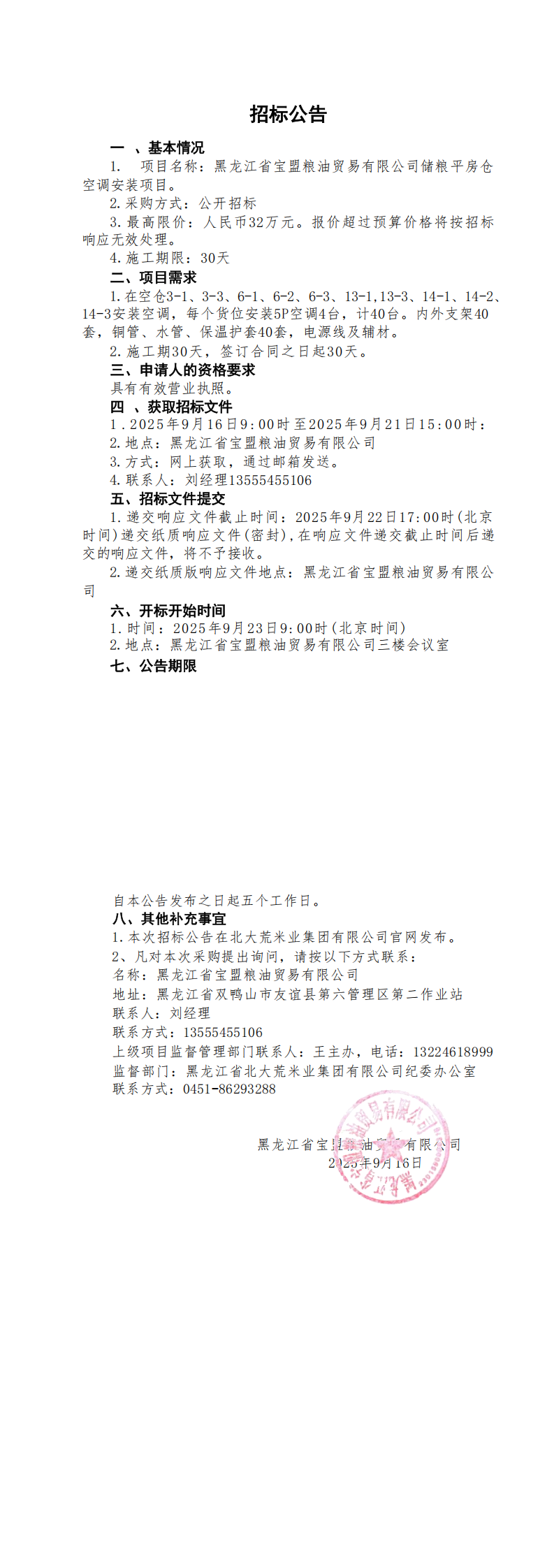 黑龍江省寶盟糧油貿易有限公司儲糧平房倉 空調安裝項目招標公告