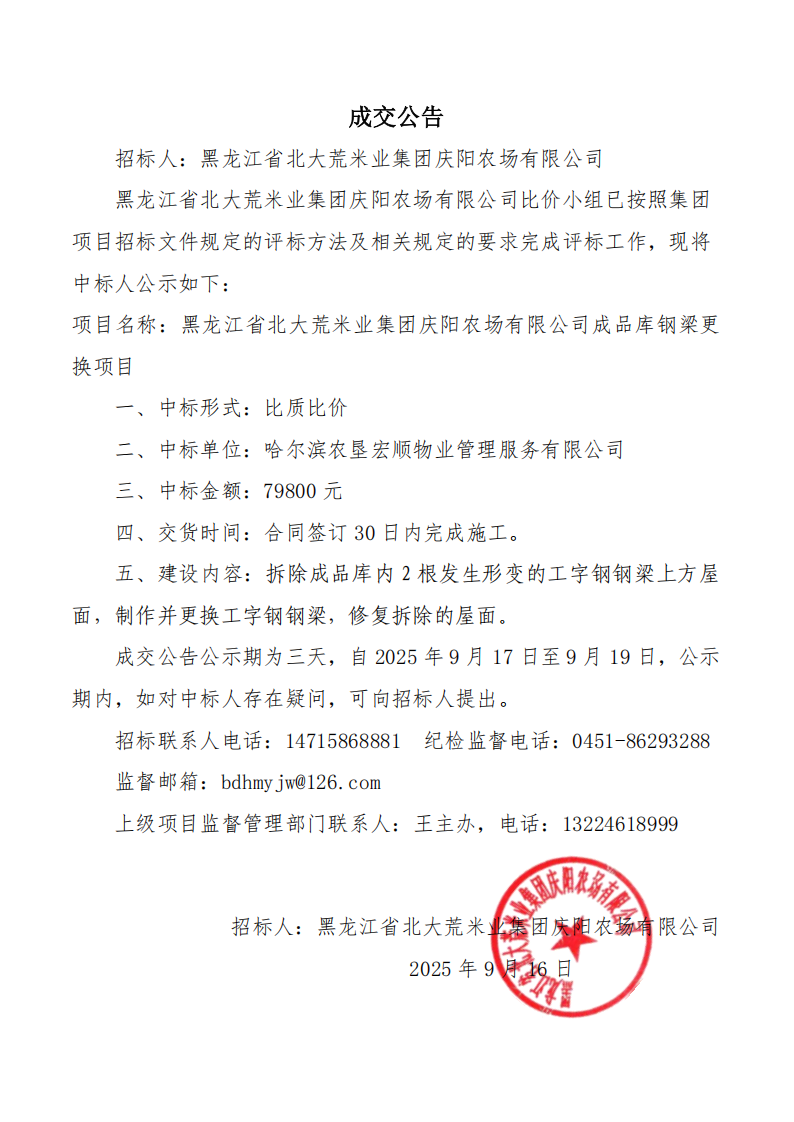 北大荒米業集團慶陽農場有限公司成品庫鋼梁更換項目中標公告